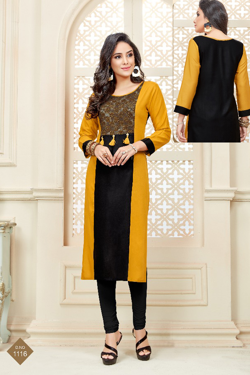 Yellow-And-Black-Double-Color-Fancy-Casual-Wear-Rayon-Knee-Length-Kurthi